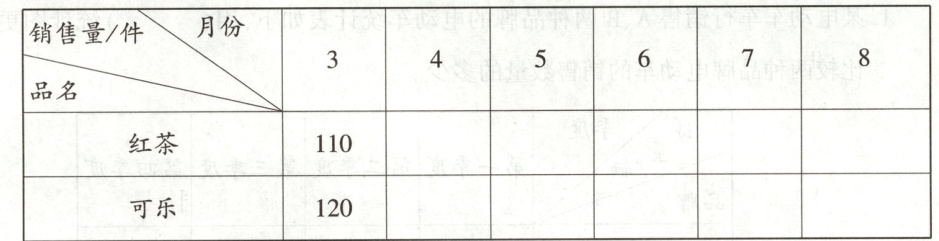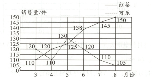 1. (横排)120 125 138 145 150 110 130 120 110 105 2. 红茶的销售量呈上升趋势,可乐的销售量呈下降趋势。 3. 多进红茶,少进可乐。