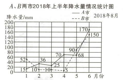 (3)( )月$A$、$B$两市的降水量最接近;( )月$A$、$B$两市的降水量相差最大。