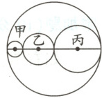 8. 如右图,一个大圆中的三个小圆甲、乙、丙的直径分别是1厘米、2厘米、3厘米。丙圆的面积是大圆的$\frac{()}{()}$,三个小圆的周长之和( )大圆的周长。