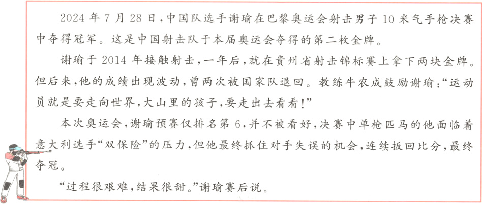 1. 同意。因为谢瑜在成绩出现波动、两次被国家队退回的情况下没有气馁,而是勇敢地面对困境,最终在奥运赛场上逆势夺冠。他的精神和白桦精神有相同之处。2. 示例:怀揣梦想,沉着冷静,子弹如流星飞去,击垮了强敌,成就了自己。