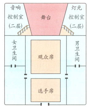 (3) 亮亮,你应该在音响控制室候场,所以应该从靠近女卫生间一侧的楼梯上台准备。
