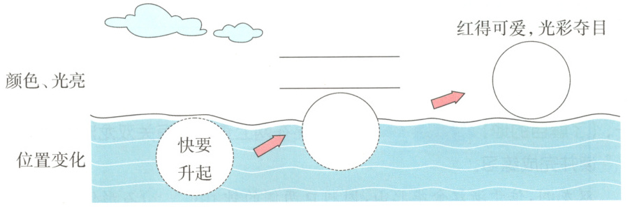 1.③②④① 2.位置变化:出现小半边脸 完全跳出海面 颜色、光亮:红是真红,没有亮光 3.