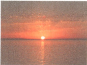 上升,到了最后,终于冲破了云霞,完全跳出了海面,颜色红得非常可爱。一刹那间,这个深红的圆东西,忽然发出了夺目的亮光,射