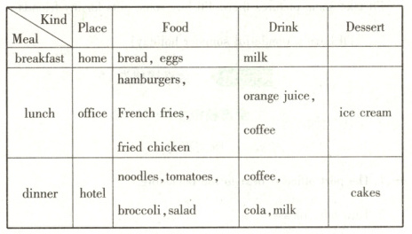 My name is Bush. I have three meals in a day. For breakfast, I have bread, eggs and milk at home. For lunch, I have it in my office. I have hamburgers, French fries, fried chicken, orange juice and coffee. My dessert(甜点) is ice cream. In the hotel I have my dinner. I like noodles, tomatoes, broccoli(西兰花) and salad. My favourite drink is coffee, cola and milk. Cakes are also my dessert.