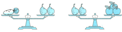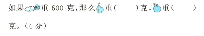 300 200 [解析:因为1个萝卜=2个梨=3个苹果=600克,所以1个梨重600÷2=300(克),1个苹果重600÷3=200(克)。]
