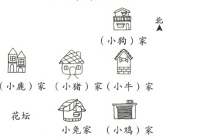 (1)小猪家在小兔家的北面;小鹿家在小猪家的西面;小鸡家在小兔家的东面,小牛家的南面;小狗家在小牛家的北面。