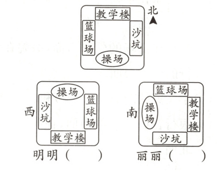 4.[推理探究]下面是阳光小学主要建筑的示意图。明明和丽丽参观校园后分别画了校园主要建筑的位置图,谁画的对?请在( )里画“√”。