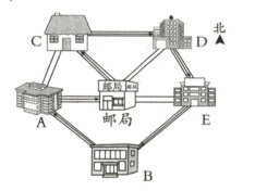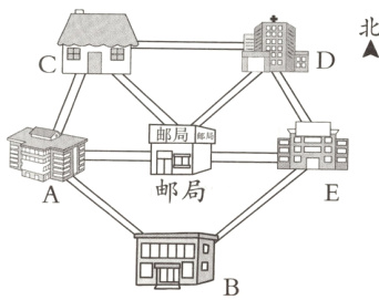 3. 邮递员王叔叔从邮局出发分别给A,B,C,D,E五个房子里的客户送报纸,送完后返回邮局。请你帮他设计一条既不重复,又把所有快递都送到的路线,用彩笔标出来,并说一说应该怎么走。