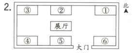 2. 走进科技馆大门,展厅的北面是电脑屋,南面是气象馆,展厅的东北方向是环保屋,西北方向是天文馆,在展厅的东南方向是生物馆,西南方向是航模馆。请你根据描述,把这些馆名的序号填在图中适当的位置上。