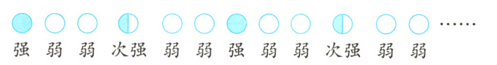 强 28 [解析:观察题图发现乐曲的强弱是按照●○○●○○为强弱弱次强弱弱一组的规律重复进行的,43÷6 = 7(组)……1(拍),所以第43拍是强拍;当演奏到第5个次强拍时,说明前面已经演奏完成了4组,也就是4×6 = 24(拍),次强拍是一组的第4拍,所以已经演奏了24 + 4 = 28(拍)。]