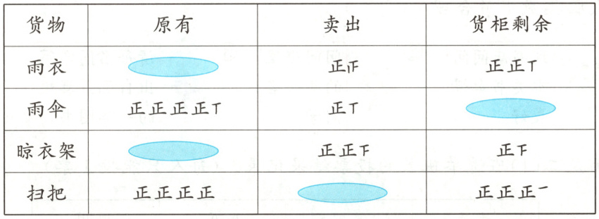 1. 雨衣原有数量是( )件,货柜剩余( )把雨伞,晾衣架原有数量是( )个,扫把卖出( )把。(8分)