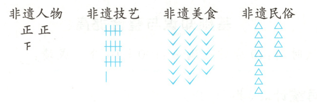 七 亮点原创 学校开展非遗研学活动,共有“非遗人物”“非遗技艺”“非遗美食”“非遗民俗”四大主题的非遗研学路线,下面是亮亮统计的二年级每个主题研学路线的参加人数。(每个人只能参加1种)(共13分)