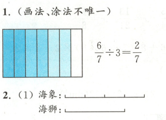 1. 把$\frac{6}{7}$平均分成3份,每份是多少?画一画,涂一涂,再用算式表示结果。(3分)