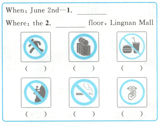 十三 听录音,补全信息卡,并在标识下方对应的括号内画“√”。(8分)
