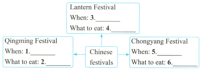 (一)1. April 2. qingtuan 3. February 4. tangyuan 5. October or November 6. Chongyang cakes