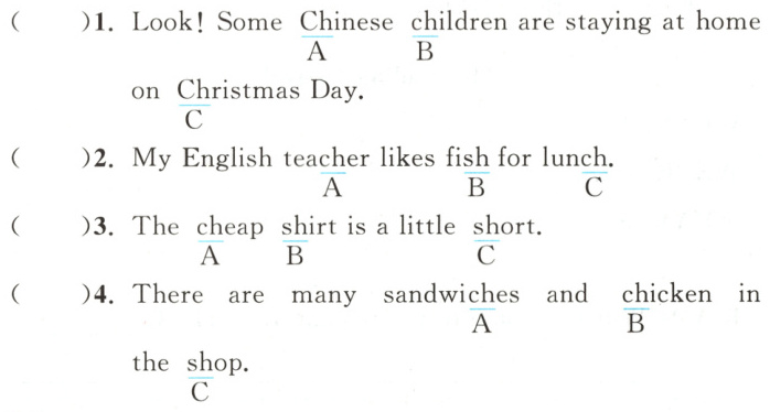 ### 一、读句子,选出画线部分发音不同的一项。(4分)