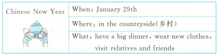 1. Chinese New Year 2. January 3. countryside 4. a big dinner 5. wear new clothes
