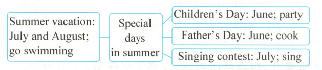 There are some special days in summer. Children’s Day is in June. We will have a big party. Father’s Day is in June, too. I will cook for my father. The singing contest is in July. I’ll sing a song. Summer vacation is in July and August. I will go swimming. I love summer!