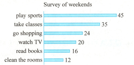 (新趋势 图表阅读) Hello,I’m Dora. In my class,most students have colourful weekends. They like to go outside. Forty-five students 1. ________ and twenty-four students go shopping with their families or friends. Most students are busy on the weekend. They 2. ________,such as maths,Chinese,English,music,dancing and so on. They study hard. But a few students like to stay at home. Twenty students 3. ________ and sixteen students like to 4. ________. Only twelve students 5. ________. That’s all for my report. Thank you!