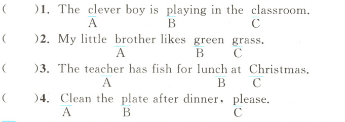 ### 一、到了游戏环节,亮亮邀请同学们一起“找不同”。读句子,选出画线部分发音不同的一项。(4分)