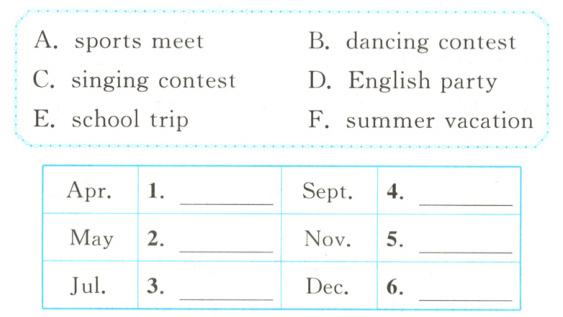 ### 四、点点根据校历分享了今年的校园活动。听录音,根据所听短文,完成下列任务。(9分)