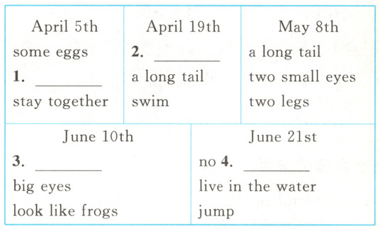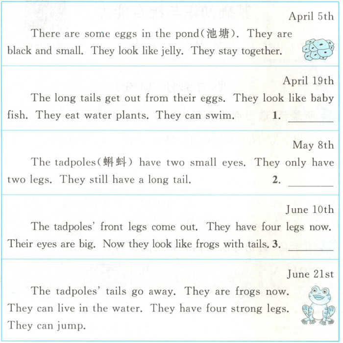 #### (一)新趋势 图片选择 阅读日记,根据小青蛙的成长过程,为Lily的日记配图,将序号写在横线上。(3分)
