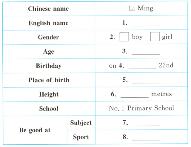 1. Eric 2. boy 3. 11/eleven 4. March 5. Chongqing 6. 1.51 7. English 8. football