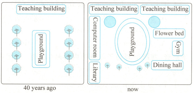 六、新趋势 图片理解 下面是$Miss$ $Wang$母校过去与现在的平面图。看图,判断正$(T)$误$(F)$。(5分)