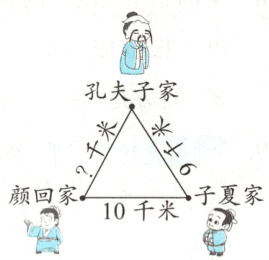 3. 亮点原创 孔子的两名弟子颜回和子夏,他们三人家的位置如图所示,颜回从家出发直接到孔子家,最多要走多少千米?(取整千米数)(4分)