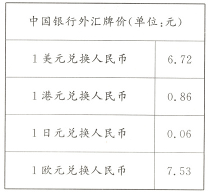 C [解析:6.72×11 = 73.92(元),100×0.86 = 86(元),1100×0.06 = 66(元),7.53×10 = 75.3(元),66 < 73.92 < 75.3 < 86,在日本的标价最低。]