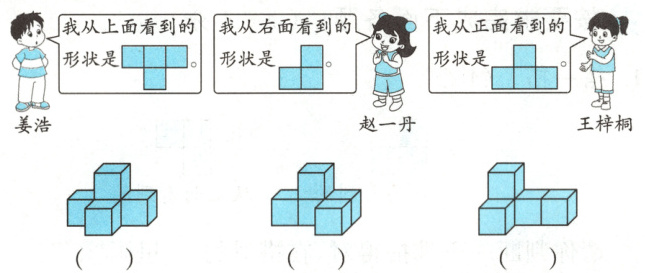 1. 姜浩和赵一丹、王梓桐三人从不同方向观察一个立体图形。根据对话,在正确的立体图形的括号里画“√”。(4分)