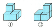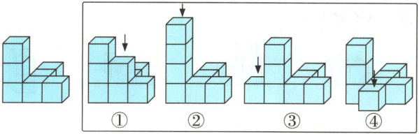 2. 在左图中添上一个小正方体后,从右面观察,形状和原来完全一样的是( )。