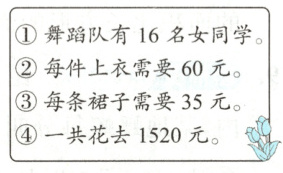 3. 新趋势 开放探究 学校准备举办元旦文艺晚会,需要给舞蹈队的女同学购买服装,每人一件上衣和一条裙子。从下面的信息中选择3个信息提出一个数学问题并列方程解答。(5分)