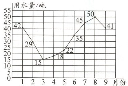 (3) (42 + 29 + 15 + 18 + 22 + 35 + 45 + 50 + 41)÷9 = 33(吨) [解析:求平均用水量,要用总用水量除以月份个数。]