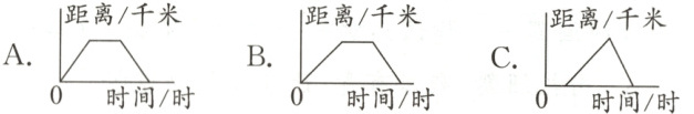 4. 五年级同学参加了一次登山活动,他们以2千米/时的速度登山,到达山顶后玩了1时,又以3千米/时的速度下山。如图,基本能反映出他们从登山开始到下山结束,离山底的距离与时间之间关系的是( )。