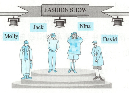 Welcome to our fashion show! The first one is Molly. She has a 1. c________ and a 2. s________. We need them on a 3. c________ day. The second one is Jack. He wears a hat and 4. p________. He is so cool. The next one is Nina. She is cute. She has a colourful and oversized (超大尺寸) 5. s________. Look at that boy. He is David. His 6. s________ is so long. But he wears his black shoes and grey (灰色的) 7. s________.