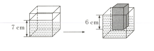 [解析]分析可知,正方体容器中3 cm高的水的体积等于高为6 cm的铁块的体积,该部分体积为10×10×(10 - 7)=300(cm³),接着可以求出铁块的底面积为300÷6 = 50(cm²),这个铁块的高为8 cm,因此铁块的体积为50×8 = 400(cm³)。