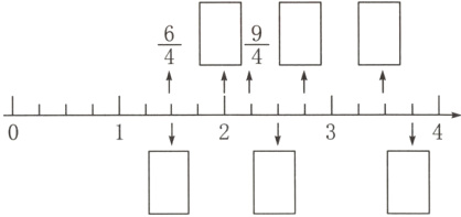 4. 在直线上面的框里填上合适的假分数,在直线下面的框里填上合适的带分数。