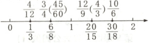 $\frac{3}{4}$ , $\frac{6}{8}$ 和 $\frac{45}{60}$ , $\frac{4}{12}$ 和$\frac{1}{3}$ , $\frac{10}{6}$ 和 $\frac{30}{18}$ , $\frac{12}{9}$ , $\frac{20}{15}$ 和 $\frac{4}{3}$ 在直线上分别能用同一个点表示。