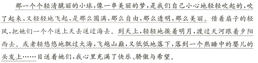 3. “或者轻悠悠地飘过大海,飞越山巅,又低低地落下,落到一个熟睡中的婴儿的头发上……”这句话是作者的(A. 所见 B. 想象)(选择正确的答案,画“√”)。“轻悠悠”一词突出了肥皂泡的__________。(2分)