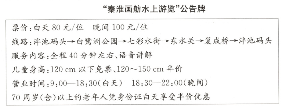 (3)首先,她们18:00到达泮池码头,结合营业时间和游览时长,应该购买晚间票;其次,小琳身高130cm,可以购买半价票,妈妈和小月应该购买全价票。 [解析]