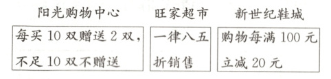 阳光购物中心:60÷(10+2)=5(组) 80×10×5=4000(元) 旺家超市:80×60×85%=4080(元) 新世纪鞋城:80×60=4800(元) 4800÷100×20=960(元) 4800−960=3840(元) 3840<4000<4080 到新世纪鞋城购买最合算