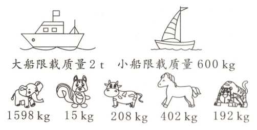 1598+15+208+402+192=2415(kg) 2t=2000kg 2415<2000+600 能同时过江。大象和松鼠、奶牛坐大船,其他两个坐小船。(乘坐方式不唯一)