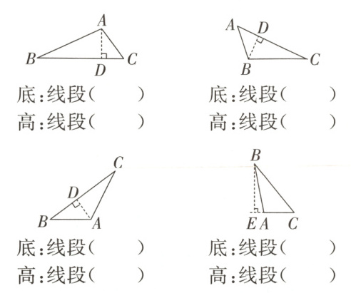 2. 写出下列三角形的底和对应的高。