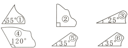 6. [思维拓展]有一堆碎纸片(如下图),浩浩认为一定能从中挑出3张纸片,使它们对应的三个角凑在一起能拼成一个等腰三角形,你同意他的想法吗?写出你的理由。