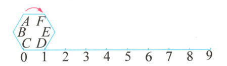 下图的六边形转一圈的过程中,A对应的数字是( ),C对应的数字是( ),D对应的数字是( )。(六边形的边长和直线上一小格的长度相等)