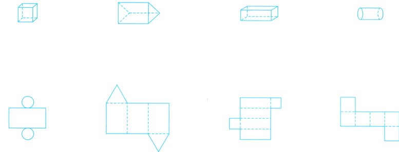 3. 下面的图形分别是上面哪个盒子的展开图?想一想,连一连。