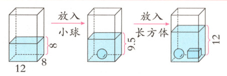 长方体 解析:由题中前两幅图可知,小球放入水中,水面升高$9.5 - 8 = 1.5$(厘米);由题中后两幅图可知,长方体放入水中,水面升高$12 - 9.5 = 2.5$(厘米)。放入长方体水面升高的高度大于放入小球水面升高的高度,所以长方体的体积大于小球的体积。