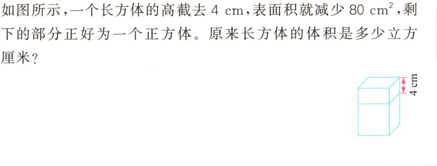 如图所示,一个长方体的高截去4 cm,表面积就减少80 cm²,剩下的部分正好为一个正方体。原来长方体的体积是多少立方厘米?
