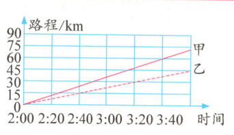 102 63.75 解析:下午2:00至下午4:50共170分钟。甲下午2:00至下午3:40,用时100分钟骑行60 km,则170分钟骑行了$170\times\frac{60}{100}=102(km)$;乙下午2:00至下午2:40,用时40分钟骑行15 km,则170分钟骑行了$170\times\frac{15}{40}=63.75(km)$。